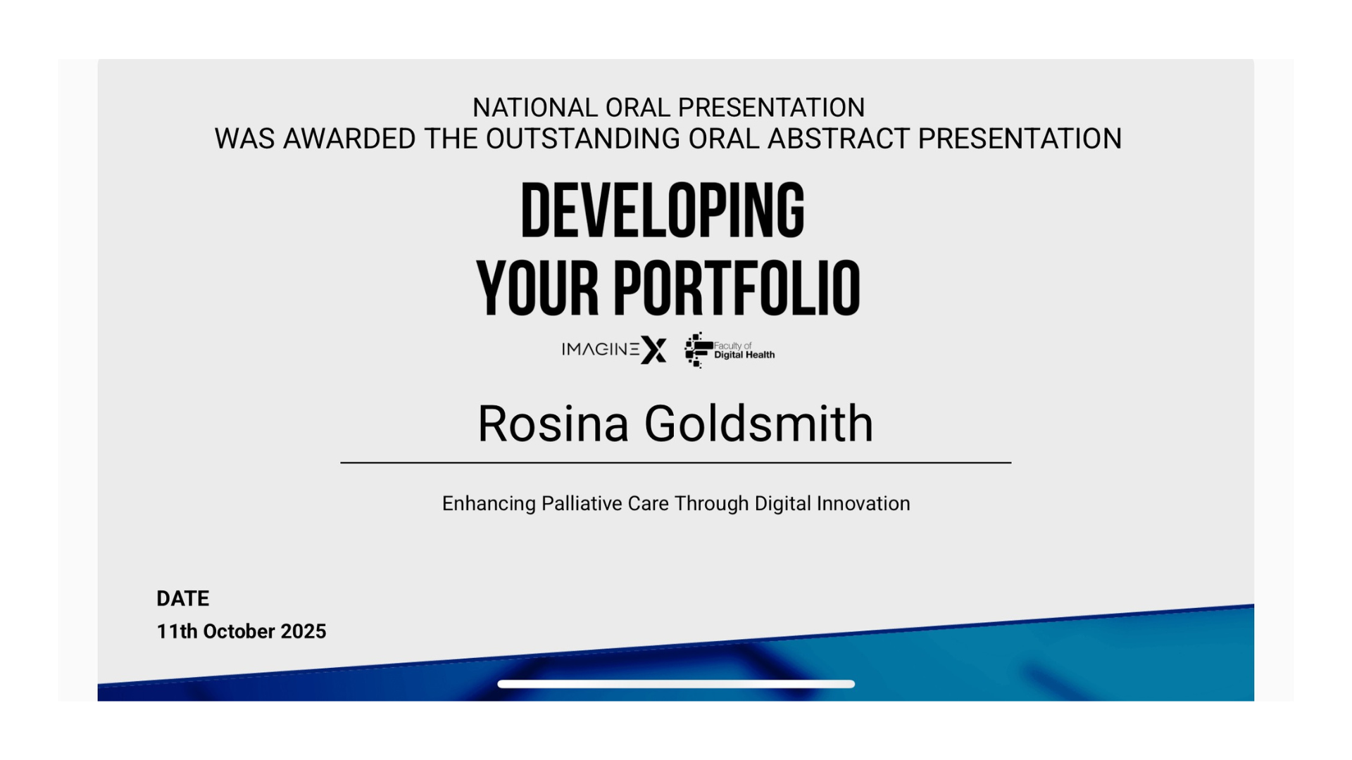 Receiving the Outstanding Oral Abstract Presentation award was an important moment for Rosina and for Pal’s ongoing work in digital palliative care.